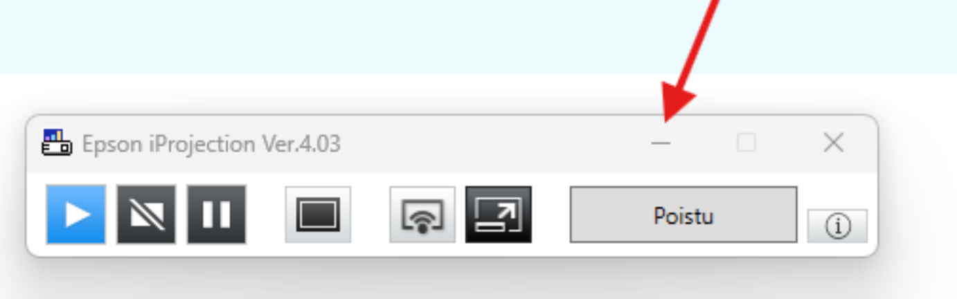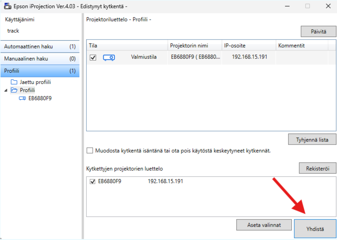 Kun tietokone ja videotykki ovat käynnistyneet valitse EB6880F9 ja paina “Yhdistä”. Voit piilottaa iProjection sovelluksen painamalla “–”